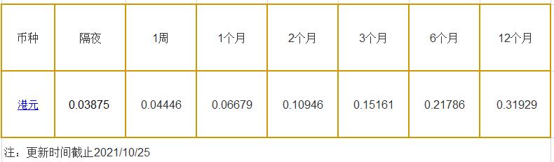 10月25日香港银行间同业拆借利率港币: 隔夜报0.03875%, 1周期报0.04446%, 1月期报0.06679%, 12月期报0.31929%。 香港银行同业拆放利率HIOR(HogkogItrakOffrdRat),指香港货币市场上,银行与银行之间的一年期以下的短期资金借贷利率,是从伦敦同业拆借利率(LIOR)