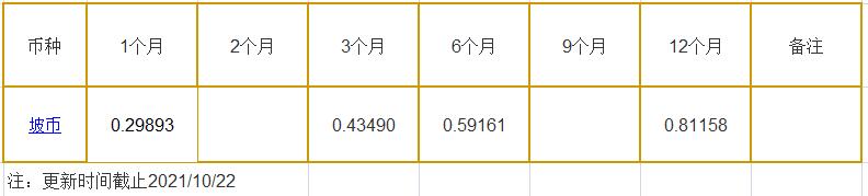 10月22日新加坡银行间同业拆借利率坡币: 1月期报0.29893%, 3月期报0.43490%, 6月期报0.59161%。 12月期报0.81158%。