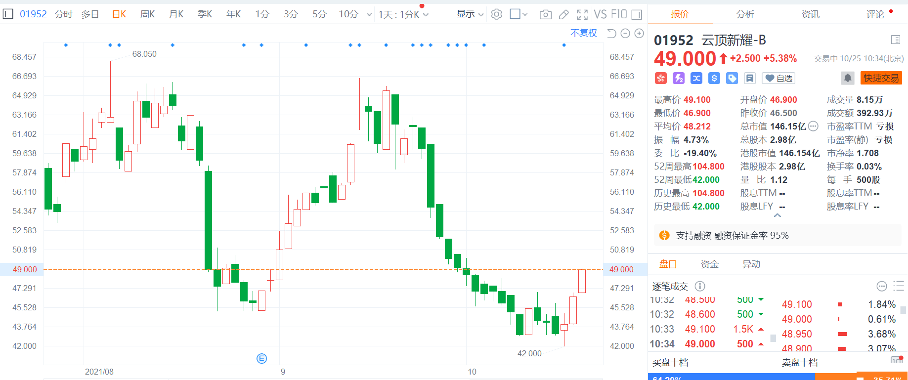 云顶新耀-(01952.HK)涨逾5%,暂录三连涨,报49港元,总市值146亿港元。 进入10月份以来,云顶新耀多次进行了回购操作,累计耗资3444万港元。具体来看,10月4日耗资1432万港元回购29.35万股,每股价格为47.9-50港元。10月21日耗资1843.6万港元回购42.35万股,每股价格为45-42.85港元。上周五,公司再次