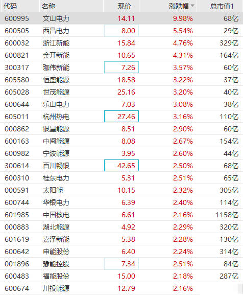 电力板块快速拉升,文山电力涨停,西昌电力、浙江新能、金开新能、乐山电力、嘉泽新能、恒盛能源等涨幅居前。
