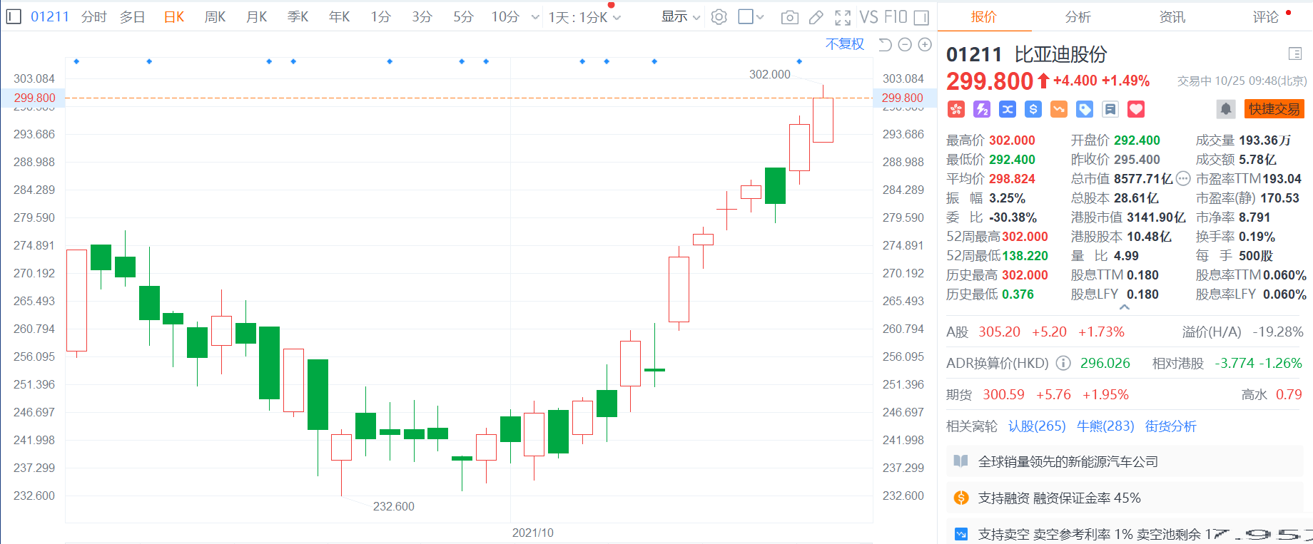 比亚迪股份(1211.HK)涨1.49%,报299.8港元,盘初高见302港元,突破300港元大关,最新总市值8578亿港元; 比亚迪(002594.Z)亦涨1.73%。比亚迪将于本周四发布季报;此外,国内有媒体最新消息显示,特斯拉或已经与比亚迪公司敲定了一份10GWh的电池采购协议,上述产量足够每年装备20万块5kWh的电池。比亚迪