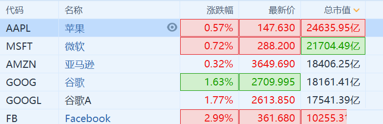 苹果涨0.57%,微软涨0.72%,亚马逊涨0.32%,谷歌涨1.63%,Facook涨近3%。