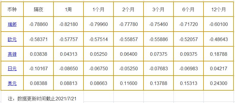 7月21日伦敦银行同业拆借利率: 隔夜LIOR:瑞郎报-0.78860%,欧元报-0.58371%,英镑报0.03838%,日元报-0.10167%,美元报0.08388%; 1周LIOR:瑞郎报-0.82180%,欧元报-0.57757%,英镑报0.04313%,日元报-0.08650%,美元报0.08813%; 1个月LIOR:瑞郎报-0.79960%,欧元报-0.57514%,英镑报0.052