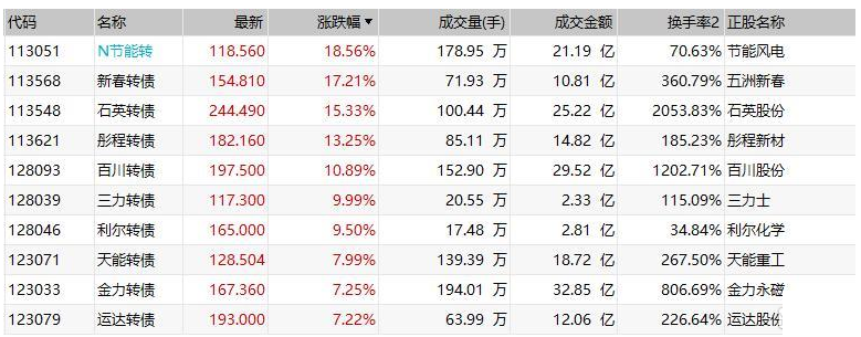 中证转债指数收盘涨0.63%,成交额923.98亿元;“节能转”涨超18%,石英转债涨超15%,两只债券均盘中临停;新春转债涨超17%,彤程转债涨超13%,百川转债涨逾10%,三力转债和利尔转债均涨逾9%,天能转债涨近8%;中天转债跌近12%,天铁转债跌超6%。