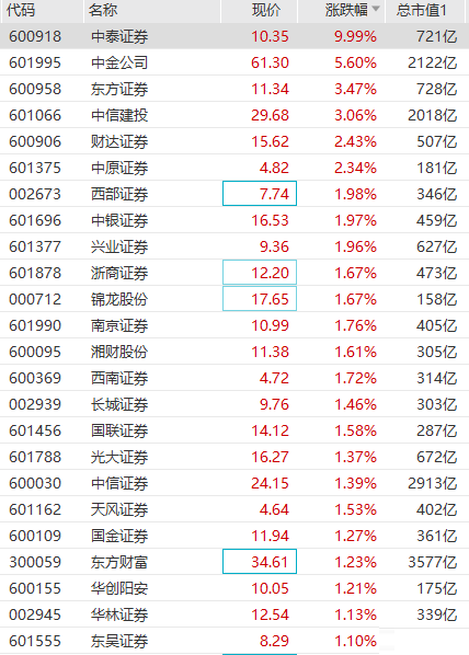 券商板块走强,中泰证券封涨停,中金公司涨超5%,东方证券、中信建投涨超3%,财达证券、中原证券、西部证券、中银证券等纷纷跟涨。截至目前,共有5家券商发布业绩快报,海通证券上半年净利润81.04亿元,盈利金额居首,其次是光大证券,净利润为22.62亿元;方正证券增幅最高,净利润同比增长102.70%。光大证券指出,当