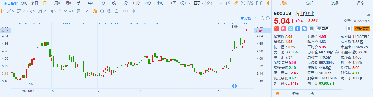 南山铝业(600219.H)股价继续走强,盘中一度触及涨停价5.09元创2008年5月份以来新高,现报5.04元,涨幅8.8%,最新总市值602.3亿。 公司昨日公告称,拟建设汽车轻量化铝板生产线项目,项目总投资约为20亿元;本项目建成后,每年将新增汽车轻量化铝板带产能20万吨。