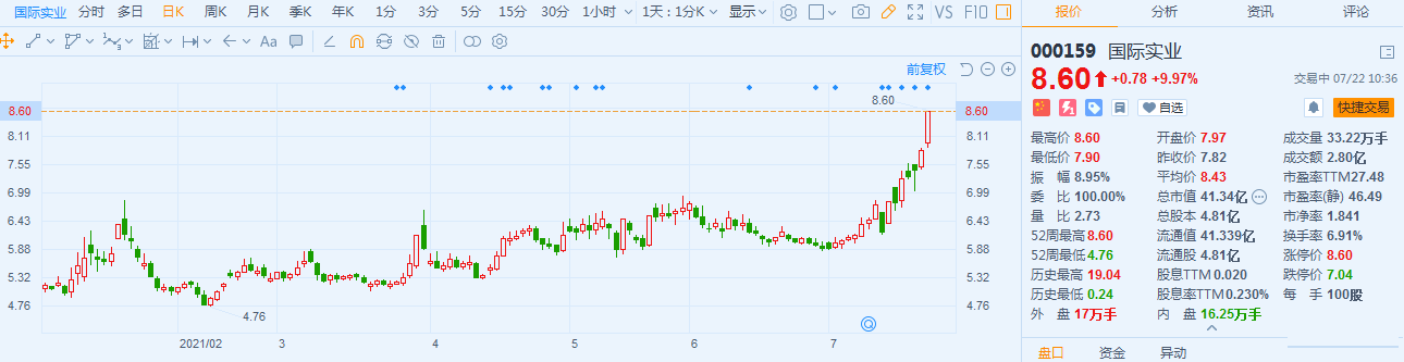 国际实业(000159.Z)涨停,报8.6元创2019年6月份以来新高,最新总市值41.34亿,换手率6.9%;月内累计涨45%。 公司21日公告称,拟将持有的万家基金40%股权,作价9.5亿元转让给新动能基金公司,交易完成后,公司不再持有万家基金股权。公司通过此次交易剥离与主营业务关联度较低的资产,将财力、物力集中