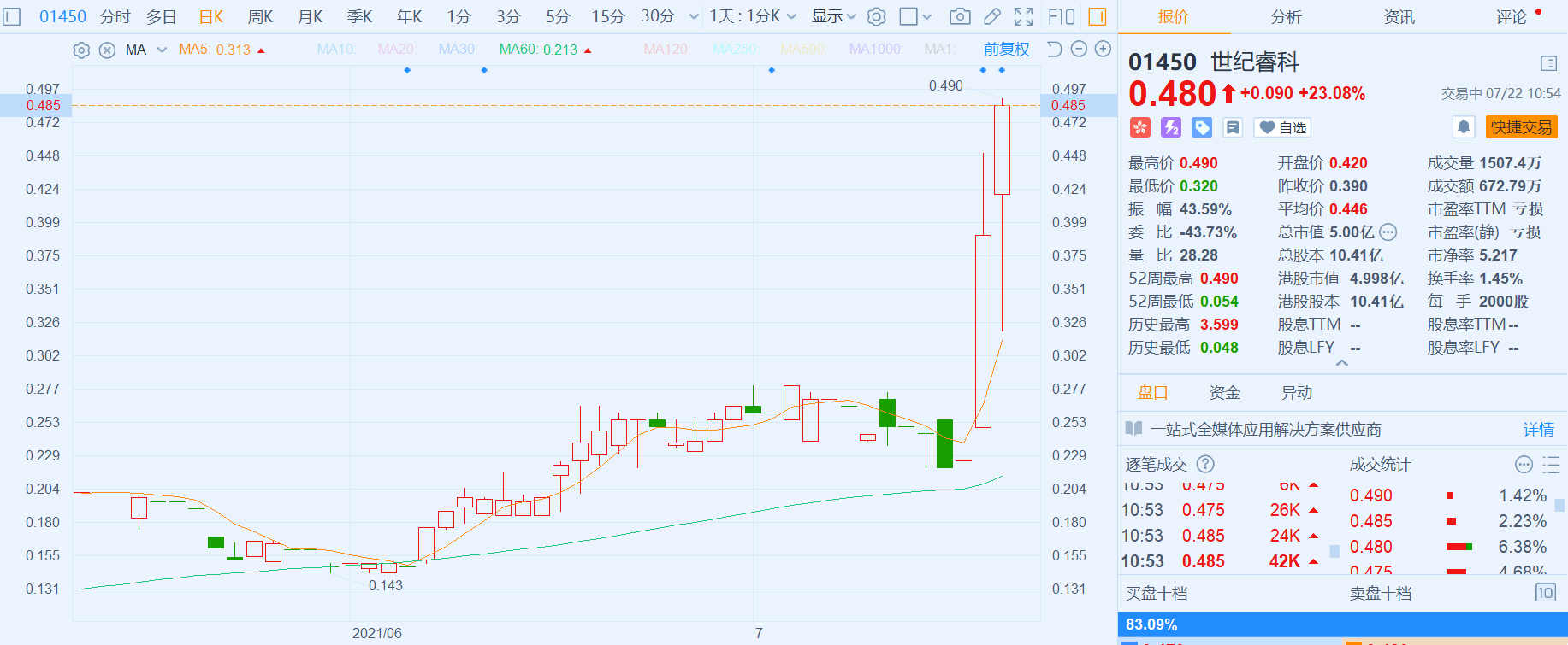 世纪睿科(1450.HK)复牌暴涨23%,报0.48港元创近三年半新高,成交额放大至673万港元。 董事会获告知公司主席、执行董事兼控股股东卢志森先生及执行董事梁荣辉先生计划可能出售CrulaCoatLiitd及FuturiraclLiitd持有的全部或部分股份予若干名独立第三方。此外,若干独立认购人拟认购公司将发行