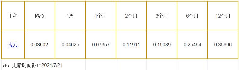 7月21日香港银行间同业拆借利率港币: 隔夜报0.03602%, 1周期报0.04625%, 1月期报0.07357%, 12月期报0.35696%。 香港银行同业拆放利率HIOR(HogkogItrakOffrdRat),指香港货币市场上,银行与银行之间的一年期以下的短期资金借贷利率,是从伦敦同业拆借利率(LIOR)