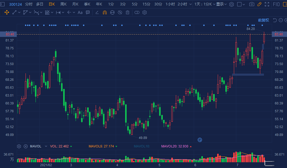 汇川技术(300124.Z)跳空高开,现涨超7%,盘中报84.2元创历史新高价,总市值达2175亿元。 汇川技术20日公告,预计上半年盈利15.1亿元-17.4亿元,同比增长95%-125%。公司通用自动化业务、新能源汽车业务、工业机器人业务均取得快速增长。东吴证券点评称,工控自动化和新能源汽车需求旺盛,公司中报预告再