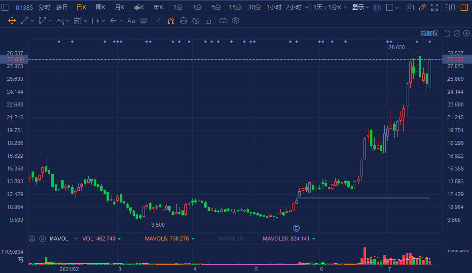 上海复旦(1385.HK)大幅拉升涨至11%,报27.85港元欲再创历史新高,暂成交1.2亿港元,总市值超190亿港元。 上海复旦拟7月22日(明日)就科创板上市发行举行网上路演。该公司本次拟发行股份1.2亿股A股,占发行后总股本比例为14.73%。另外,公司于7月12日获高盛增持218.8万股,涉资约5287.35万港元。