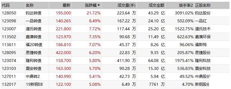 中证转债指数收盘涨0.27%,成交额890.57亿元;钧达转债涨超21%,盘中临停;一品转债涨超8%,道氏转债、嘉澳转债和“福20转债”均涨超7%;恩捷转债涨超6%,隆利转债、震安转债、“中鼎转2”和“19新钢”均涨逾5%;维格转债跌超24%,盘中临停;盛路转债跌超18%,横河转债跌逾10%。