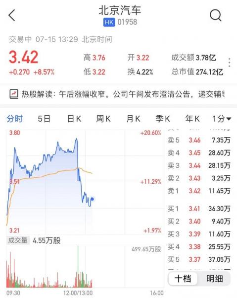 今日早盘一度大涨近20%的北京汽车(1958.HK)午后跳水,现报3.42港元,涨幅收窄至8.57%,暂成交3亿港元,最新市值274亿港元。 北京汽车今日午间在港交所公告,公司注意到若干有关本公司可能首次公开发行A股股票的媒体推测以及本公司股份近期价格及成交量有所上升。本公司猜测有关报导来自于中信建投证券股