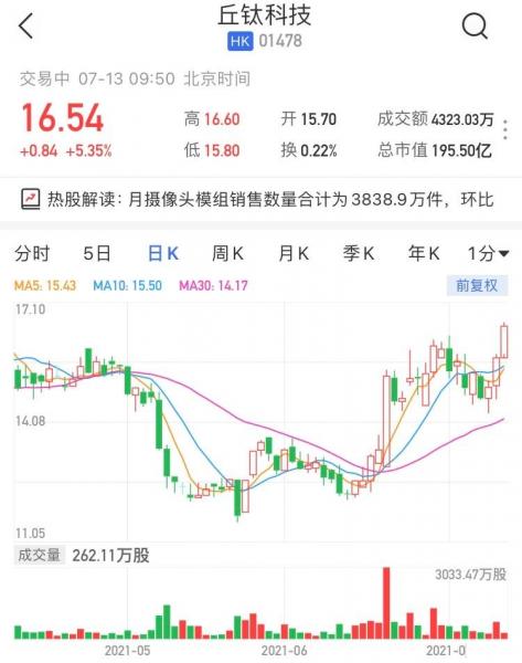 丘钛科技(1478.HK)今日续涨,现报16.54港元,涨5.35%,暂成交4323万港元,最新市值195亿港元。 丘钛科技上周五(9日)晚间披露今年6月主营产品销售数据,当月摄像头模组销售数量合计为3838.9万件,环比增长0.3%,同比增长20.5%。其中800万像素及以下摄像头模组销售数量为1246.1万件,环比增长22.2%,同比