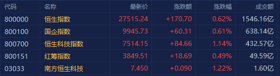 受央行全面降准影响,港股三大指数今日大幅高开,全天震荡收涨但日K线均呈假阴线,早盘恒生科技指数一度翻绿,收涨1.14%报7514点,恒指涨0.62%报27515点,国指涨0.61%报9945点。 盘面上,餐饮股大涨,餐饮三巨头(海底捞、九毛九、呷哺呷哺)均大幅拉升,海底捞大涨近9%市值重回2500亿港元上方;特斯拉概念股、生