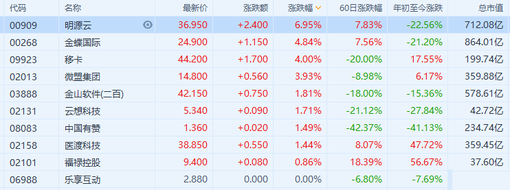 aa概念股走强,明源云(0909.HK)涨7%领涨,金蝶国际涨近5%,移卡、微盟涨约4%,金山软件、中国有赞等跟涨。大和最新发研报指,明源云管理层表示公司上半年企业资源管理(R)业务录强劲反弹,预期下半年的销售动力持续,客户需求有所改善;该行相信公司能增加aa(软件即服务)模组的交叉销售,带动相关业务增长,维持