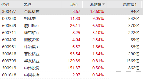 有色钴板块走强,合纵科技大涨超12%,格林美涨超9%,厦门钨业涨超6%,盛屯矿业、鹏欣资源、华友钴业等跟涨。据上海有色网,7月8日硫酸钴报价上调500元/吨,达78500元/吨,较去年同期累计涨逾七成。电解钴、钴酸锂等产品报价亦在本月以来持续上行。天风证券最新研报指出,随着新能源汽车需求的持续放量,预计未来5年全