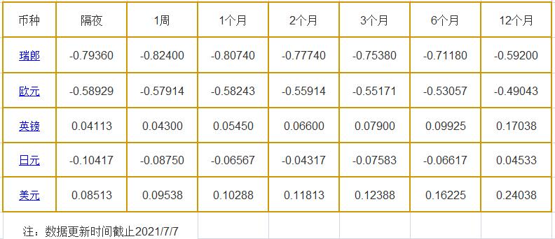 7月7日伦敦银行同业拆借利率: 隔夜LIOR:瑞郎报-0.79360%,欧元报-0.58929%,英镑报0.04113%,日元报-0.10417%,美元报0.08513%; 1周LIOR:瑞郎报-0.82400%,欧元报-0.57914%,英镑报0.04300%,日元报-0.08750%,美元报0.09538%; 1个月LIOR:瑞郎报-0.80740%,欧元报-0.58243%,英镑报0.0545