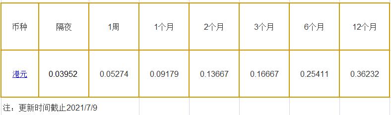 7月9日香港银行间同业拆借利率港币: 隔夜报0.03952%, 1周期报0.05274%, 1月期报0.09179%, 12月期报0.36232%。 香港银行同业拆放利率HIOR(HogkogItrakOffrdRat),指香港货币市场上,银行与银行之间的一年期以下的短期资金借贷利率,是从伦敦同业拆借利率(LIOR)变