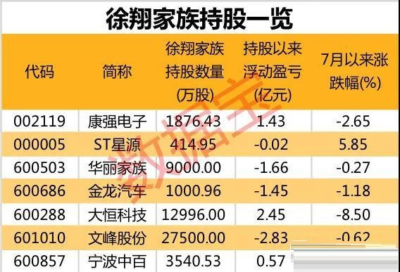 2015年11月1日,因涉嫌违法犯罪,人称“宁波涨停板敢死队总舵主”兼“私募一哥”的徐翔,被公安机关依法采取刑事强制措施,之后判决在青岛监狱服刑。根据徐翔家族的持股变动进行粗略测算,7股浮动亏损1.5亿,浮动盈利的仅3只,分别是大恒科技、康强电子及宁波中百,也仅有这3股自徐翔家族首次持股报告期以来股价呈上