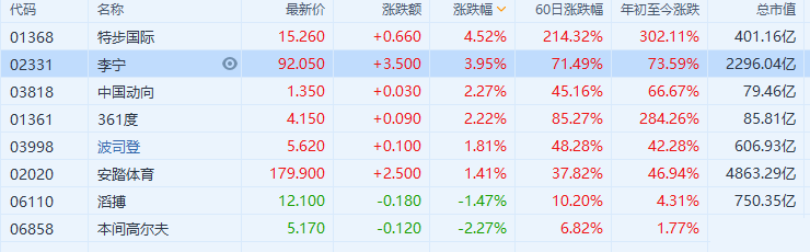 体育用品股走强,特步(1368.HK)涨超4%创历史新高,市值超400亿港元,年内已累涨超3倍;李宁涨近4%,361度、中国动向涨超2%,安踏涨超1%。特步此前获高瓴认购5亿港元可换股债券。瑞信发研报指,过往特步估值较低主要由于其增长较低,加上与市场沟通不足,而其规模亦较小,不过近期获高瓴投资后可去除投资者对公司配股
