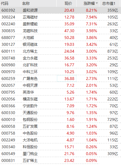 稀土永磁板块早盘持续走强,盛和资源涨超8%,正海磁材、盛新锂能涨超7%,龙磁科技、大地熊、银河磁体、北方稀土、金力永磁等跟涨。上海有色网显示,7月6日,镨钕氧化物均价报522500元/吨,单日上涨25000元/吨;镨钕金属均价报632500元/吨,单日上涨23500元/吨,均已连涨多日。国元证券认为,近期国内轻稀土市场部分价