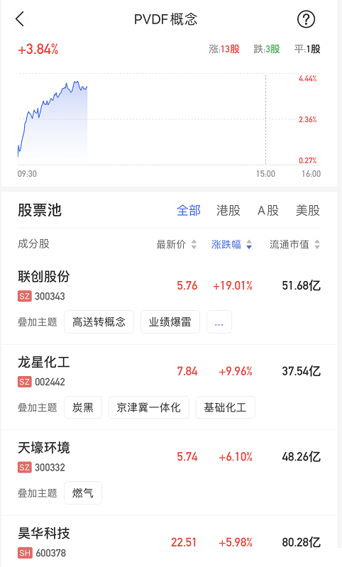 VDF概念股再度走强,联创股份大涨逾19%,龙星化工涨停,天壕环境涨逾6%。受锂电池、光伏背板的高涨需求拉动,以及各类原材料价格抬升等多因素影响,高附加值氟材料VDF(聚偏氟乙烯树脂)的价格近期不断攀升。近3个月VDF粉料、粒料价格从7万元/吨上涨到14万元/吨。锂电用VDF从11万元/吨上涨到15-20万元/吨。