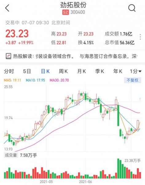 劲拓股份(300400.Z)涨停,现报23.23元,封单逾17万手,暂成交1亿元,最新市值56亿元。 劲拓股份昨日晚间宣布,公司与深圳市海思半导体有限公司签订了《海思劲拓合作备忘录》,协议签订时间为今年7月6日,协议签订地点为深圳市。基于劲拓在热工领域的能力,加之海思大力推进封测产业链国产化进程,因此