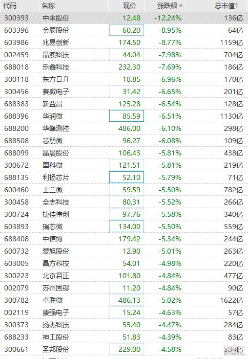 导体板块冲高回落,午后跌幅扩大至逾3%,金辰股份、兆易创新跌超8%,晶澳科技跌近8%,东风日升、赛微电子、华润微跌超6%,晶晨股份、国科微、士兰微等纷纷下跌。