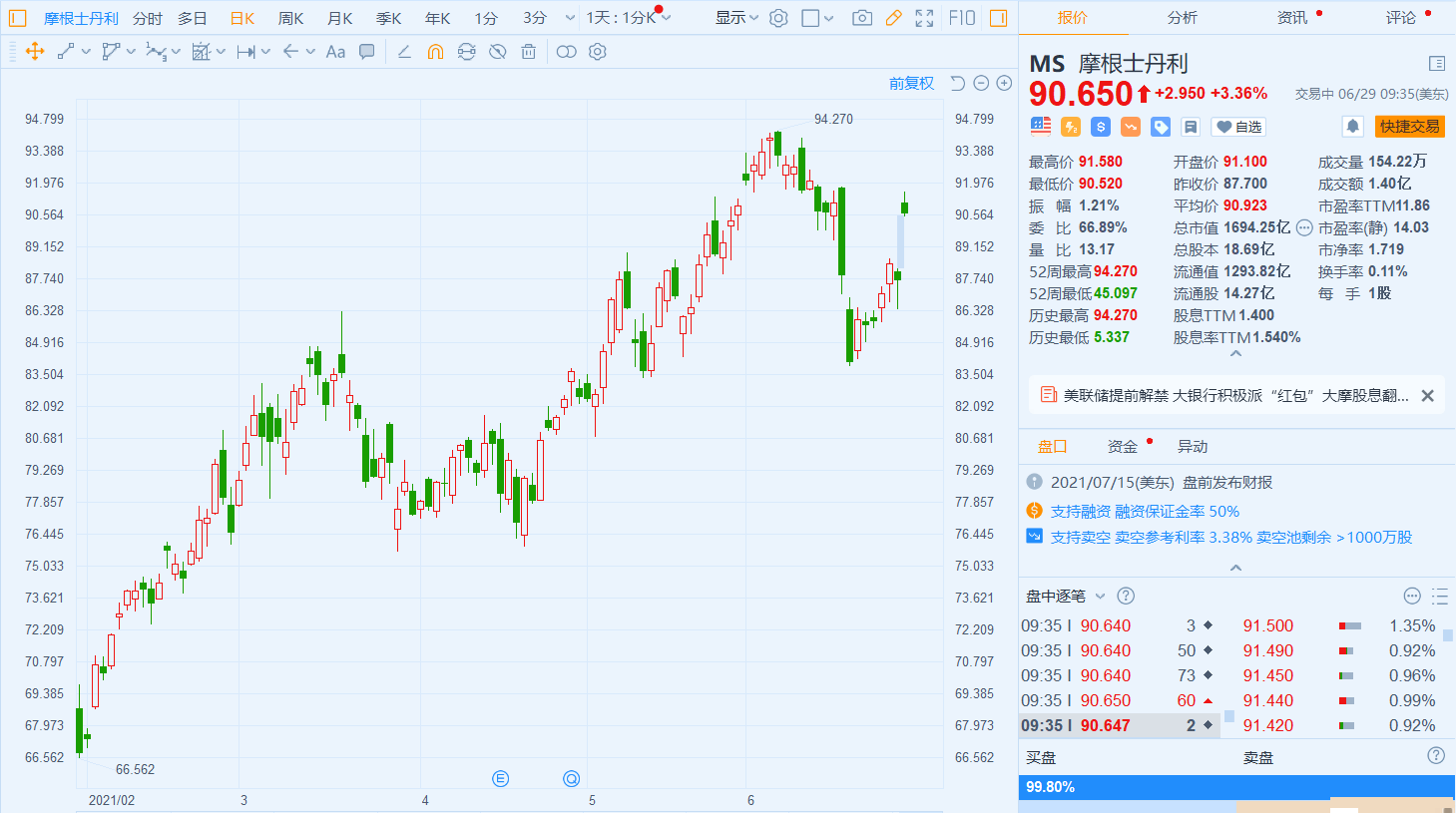 摩根士丹利(.U)今日股价高开,现涨3.36%,报90.65美元,暂成交1.4亿美元,最新总市值为1694.25亿美元。 摩根士丹利宣布,第三季度将把股息增加一倍至每股0.7美元,超出此前一些分析师所预计的由每股0.35美元上涨至约0.5美元。该行还表示,还将授权在未来12个月回购至多120亿美元普通股。