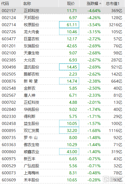 猪肉板块走低,正邦科技、天邦股份跌超4%,牧原股份、龙大肉食跌超3%,巨星农牧、天康生物、温氏股份等集体走低。昨日猪肉股大幅反弹,但北向资金净减持牧原股份3.5亿元,对待猪周期,北向显然多了一些谨慎。行业人士表示,上半年猪价长时间大幅度下跌,和生猪产能恢复良好有很大关系。总体来看,目前生猪供应相对宽