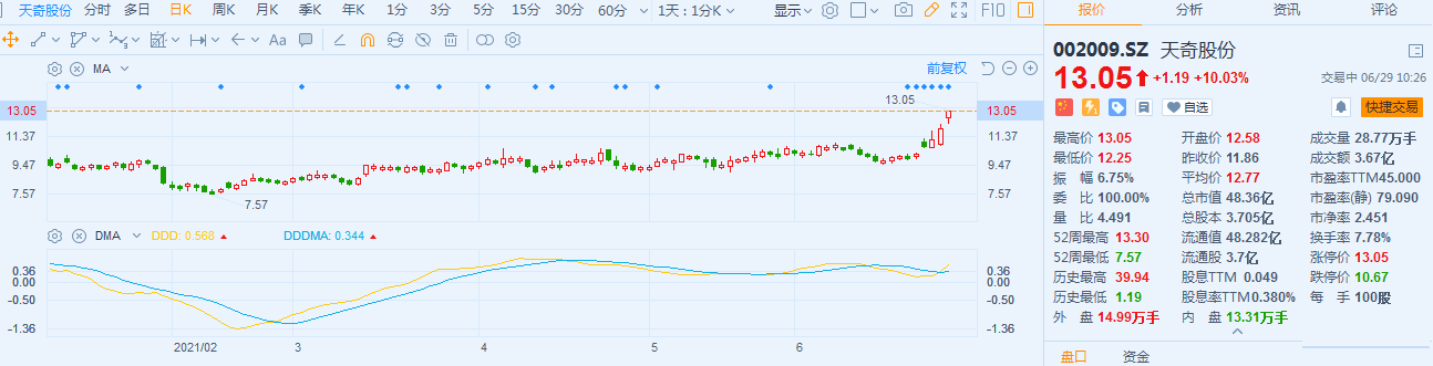 天奇股份(002009.Z)涨停,报13.05元创去年8月份以来新高,最新总市值48.4亿,换手率7.7%,现有封单13万余手。 公司28日公告称,公司及子公司拟在龙南经开区购置约397.34亩土地,在未来5年内规划投资以废旧锂电池原料为主导,形成年产3万吨三元前驱体及1.2万吨电池级碳酸锂的生产项目,项目总投资约为50