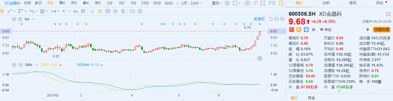 金晶科技(600586.H)股价触及涨停后回落,现报9.68元,涨幅8.76%,最新总市值138.3亿,换手率11.4%;该股此前连续两交易日涨停。 公司28日公告称,2021年半年度实现归属于上市公司股东的净利润与上年同期相比预计增加6.94亿元—7.24亿元左右,同比增加913%-953%左右。主要由于,公司玻璃板块产品毛利率