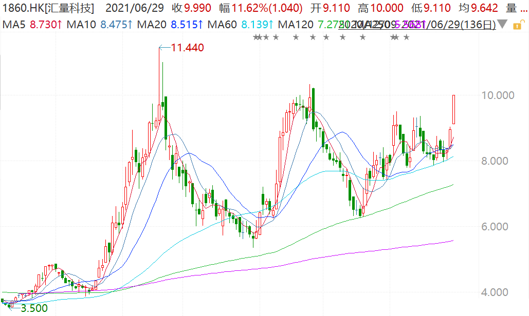 延续昨日强势,汇量科技今日再度拉升,盘中一度涨近12%报10港元,逼近前高欲寻求突破,市值超160亿港元。华为H生态系统近日宣布汇量科技旗下的GaAalytic为合作伙伴。大股东“托低式”增持,充分体现了股东的认可度以及对未来成长空间的信心,股价有可能迎来新一轮的上升拐点,走出“W”型走势的最后一划。
