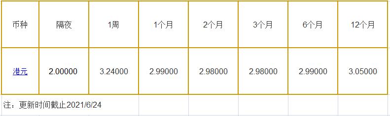 6月24日香港银行间同业拆借利率港币: 隔夜报2.0000%, 1周期报3.2400%, 1月期报2.9900%, 12月期报3.0500%。 香港银行同业拆放利率HIOR(HogkogItrakOffrdRat),指香港货币市场上,银行与银行之间的一年期以下的短期资金借贷利率,是从伦敦同业拆借利率(LIOR)变化
