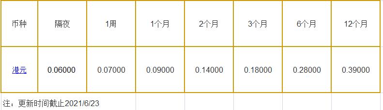 6月23日香港银行间同业拆借利率港币: 隔夜报0.06000%, 1周期报0.07000%, 1月期报0.09000%, 12月期报0.3900%。 香港银行同业拆放利率HIOR(HogkogItrakOffrdRat),指香港货币市场上,银行与银行之间的一年期以下的短期资金借贷利率,是从伦敦同业拆借利率(LIOR)变
