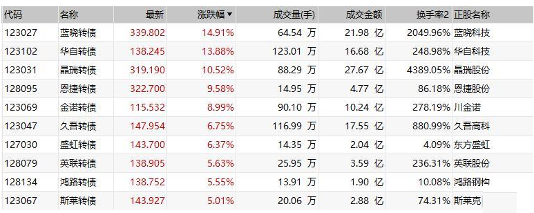 中证转债指数午盘涨0.32%,蓝晓转债涨近15%,盘中临停;华自转债涨近14%,晶瑞转债涨超10%,恩捷转债涨超9%,金诺转债涨超8%,久吾转债和盛虹转债均涨逾6%,英联转债、鸿路转债和斯莱转债均涨逾5%;万顺转债跌超7%,众兴转债跌超5%,万孚转债和精达转债均跌逾3%。