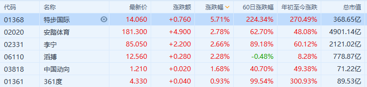 体育用品股继续走强,特步涨超5%,市值近370亿港元;李宁涨超2%,市值超2100亿港元;安踏涨超2%,市值逼近5000亿港元;三股盘中均创历史新高。自特步于6月15日早间宣布获高瓴认购5亿港元可换股债券后,该股迄今已七日连升累涨约60%,年内已累涨超2.7倍。瑞信认为特步近期获高瓴投资后可去除投资者对公司配股的忧虑,