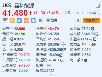 晶科能源(JK.U)股价盘中涨逾7%后回落,现报41.48美元,涨幅5.4%。 公司控股子公司上饶晶科太阳能有限公司计划投资3.15亿元人民币,对内蒙古新特硅材料有限公司增资扩股。此次投资将被用于建设年产10万吨的高纯多晶硅生产线。增资完成后,上饶晶科将持有内蒙古新特9%的股份。