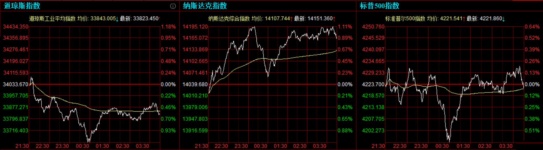 美股三大指数走势分化,道指连续第二个交易日下滑,纳指逼近历史最高收盘水平。昨日美联储上调经济增长与通胀预期,并暗示2023年底前将加息两次。美国上周首次申领失业救济人数升至41.2万,高于市场预期。 道指收跌210.22点,或0.62%,报33823.45点;纳指涨121.67点,或0.87%,报14161.35点;标普500指数跌1.84
