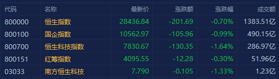 港股主要指数全线收跌,三大指数均呈单边下跌行情,盘中无明显反弹走势,市场情绪表现较差。截至收盘,恒指跌0.7%报28436点,国指跌0.99%报10562点,恒生科技指数跌1.64%报7830点。盘面上,国储局抛储,有色金属股全线大跌,紫金矿业、中国有色矿业、中国宏桥均跌逾8%;汽车股、电池股、药品股、港口航运股等热门板块