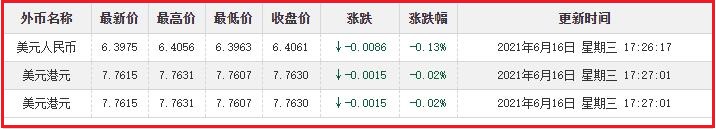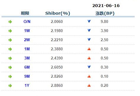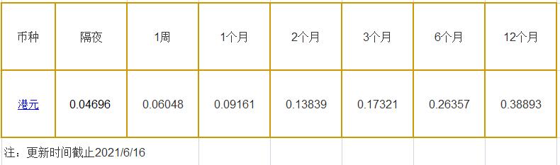 6月16日香港银行间同业拆借利率港币: 隔夜报0.04696%, 1周期报0.06048%, 1月期报0.09161%, 12月期报0.38893%。 香港银行同业拆放利率HIOR(HogkogItrakOffrdRat),指香港货币市场上,银行与银行之间的一年期以下的短期资金借贷利率,是从伦敦同业拆借利率(LIOR)