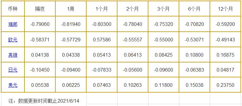 6月14日伦敦银行同业拆借利率: 隔夜LIOR:瑞郎报-0.79060%,欧元报-0.58371%,英镑报0.04138%,日元报-0.10450%,美元报0.05538%; 1周LIOR:瑞郎报-0.81940%,欧元报-0.57729%,英镑报0.04338%,日元报-0.09400%,美元报0.06225%; 1个月LIOR:瑞郎报-0.80300%,欧元报0.57586%,英镑报0.0541