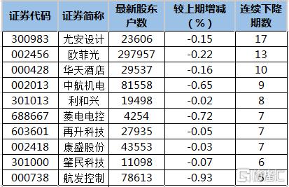数据统计显示,367家上市公司公布了截至10月10日最新股东户数,相比之前各期,有43股股东户数连续减少3期以上,股东户数最多已连降17期。股东户数连降期数较多的有尤安设计、欧菲光、华天酒店等股。从机构动向看,股东户数连降股中,近一个月获机构调研的有3只;机构调研家数看,机构较为扎堆的是欧菲光、菱电电控