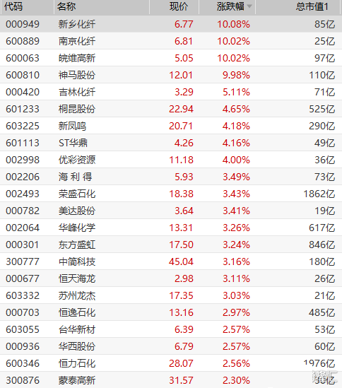 化纤板块午后继续上扬,新乡化纤、南京化纤、皖维高新、神马股份涨停,吉利化纤涨超5%,桐昆股份、新凤鸣、荣盛石化、东方盛虹、华峰化学等跟涨。据工信部6月7日消息,2021年1-4月,化纤行业生产持续增长,化纤产量为2170万吨,同比增长22.1%。化纤行业效益持续回升。化纤行业1-4月实际完成投资同比增长13.0%;规模以
