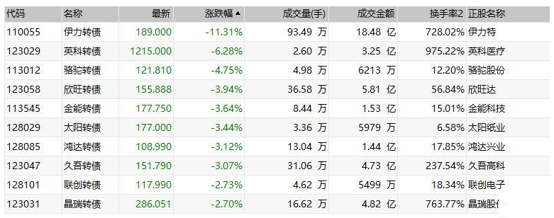 中证转债指数收盘跌0.26%,成交额417.98亿元;伊力转债跌超11%,英科转债跌超6%,骆驼转债跌超4%,欣旺转债、金能转债、太阳转债等5只债券均跌逾3%,联创转债、晶瑞转债和滨化转债均跌逾2%;常汽转债涨超12%,联泰转债涨超11%,嘉澳转债涨近6%,“九洲转2”涨近4%。