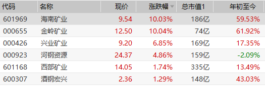 铁矿石板块午后异动拉升,海南矿业、金岭矿业双双涨停,兴业矿业涨近7%,河钢资源、大中矿业等跟涨。铁矿石主力合约盘中一度涨超6%,目前涨5.14%,报价1146元/吨。国泰君安期货表示,随着前期价格的连续暴跌,市场对于政策端调控的担忧已有较为充分的消化,心态逐步企稳。目前市场处于对于前期政策调控的恐慌情绪逐步