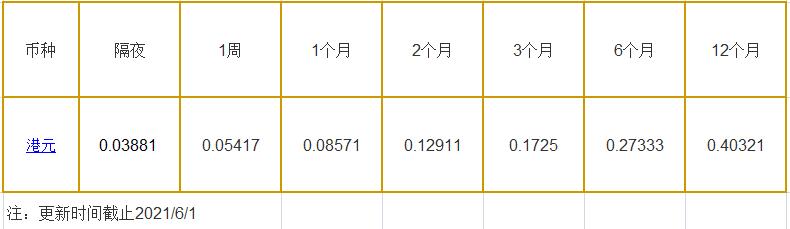 6月1日香港银行间同业拆借利率港币: 隔夜报0.03881%, 1周期报0.05417%, 1月期报0.08571%, 12月期报0.40321%。 香港银行同业拆放利率HIOR(HogkogItrakOffrdRat),指香港货币市场上,银行与银行之间的一年期以下的短期资金借贷利率,是从伦敦同业拆借利率(LIOR)变