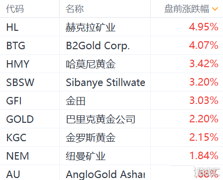 国际金银价格走高,带动美股黄金股盘前集体上涨。其中,赫克拉矿业涨近5%,哈莫尼黄金和金田涨超3%,巴里克黄金和金罗斯黄金涨超2%,纽曼矿业涨近2%。伦敦金现今日盘中一度涨超1%至1782.97美元,伦敦银现一度涨2.71%至23.799美元,创9月16日以来新高。