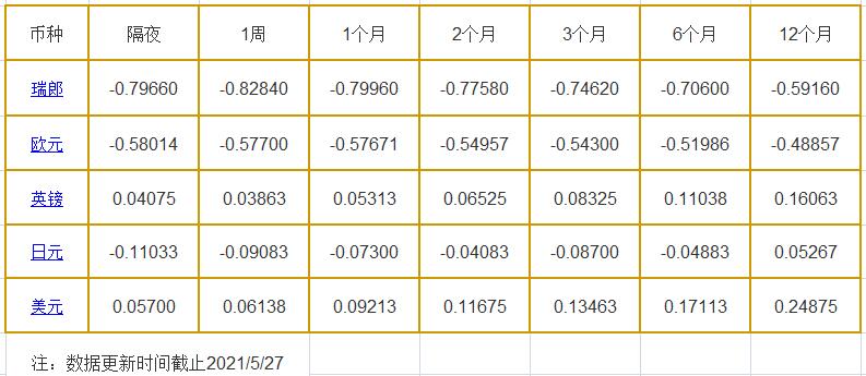 5月27日伦敦银行同业拆借利率: 隔夜LIOR:瑞郎报-0.79660%,欧元报-0.58014%,英镑报0.04075%,日元报-0.11033%,美元报0.05700%; 1周LIOR:瑞郎报-0.82840%,欧元报-0.57700%,英镑报0.03863%,日元报-0.09083%,美元报0.06138%; 1个月LIOR:瑞郎报-0.79960%,欧元报-0.57671%,英镑报0.053